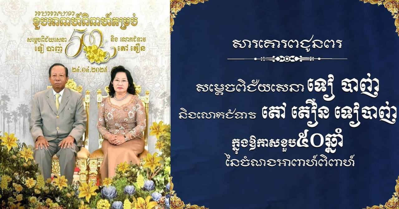 នៅក្នុងឱកាសដ៏សិរីមង្គលាភិរម្យប្រសើរថ្លៃថ្លានេះ យើងខ្ញុំសូមគោរពសម្តែងនូវសេចក្តីសោមនស្សរីករាយ និងសូមចូលរួមអបអរសាទរយ៉ាងជ្រាលជ្រៅ ក្នុងឱកាសដ៏វិសេសវិសាលនៃគម្រប់ខួបអាពាហ៍ពិពាហ៍ ៥០ឆ្នាំ របស់សម្តេចពិជ័យសេនា ទៀ បាញ់ និងលោកជំទាវ ដែលនឹងប្រព្រឹត្តទៅនៅថ្ងៃទី២៤ ខែមេសា ឆ្នាំ២០២៥នេះ។