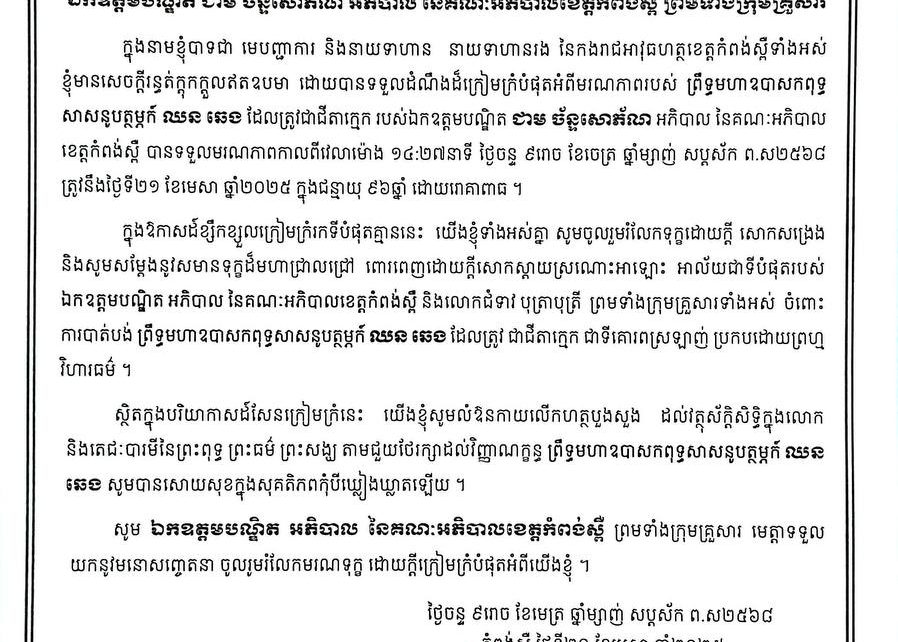 ព័ត៌មានជាតិ សាររំលែកមរណទុក្ខ ជូនចំពោះ ឯកឧត្តមបណ្ឌិត ជាម ច័ន្ទសោភ័ណ ព្រមទាំងក្រុមគ្រួសារ… សាររំលែកមរណទុក្ខ ជូនចំពោះ ឯកឧត្តមបណ្ឌិត ជាម ច័ន្ទសោភ័ណ អភិបាល នៃគណៈអភិបាលខេត្តកំពង់ស្ពឺ ព្រមទាំងក្រុមគ្រួសារ