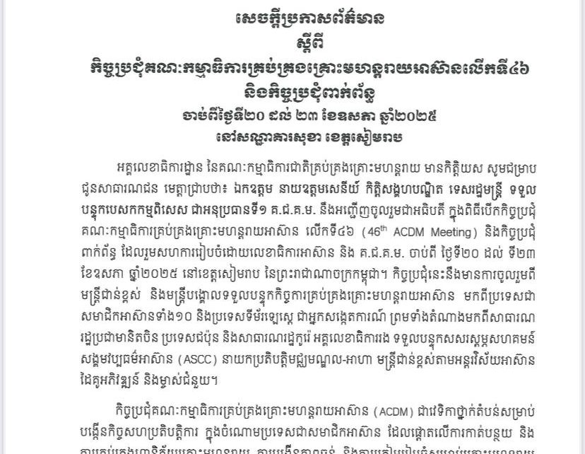 ព័ត៌មានជាតិ សេចក្តីប្រកាសព័ត៌មាន ស្តីពីកិច្ចប្រជុំគណៈកម្មាធិការគ្រប់គ្រងគ្រោះមហន្តរាយអាស៊ានលើកទី៤៦ និងកិច្ចប្រជុំពាក់ព័ន្ធ សេចក្តីប្រកាសព័ត៌មាន ស្តីពីកិច្ចប្រជុំគណៈកម្មាធិការគ្រប់គ្រងគ្រោះមហន្តរាយអាស៊ានលើកទី៤៦ និងកិច្ចប្រជុំពាក់ព័ន្ធ