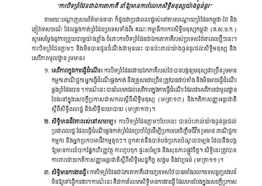 គណៈកម្មាធិការសិទ្ធិមនុស្សកម្ពុជា សម្ដែងនូវការព្រួយបារម្ភយ៉ាងខ្លាំងចំពោះការបិទព្រំដែនជាឯកតោភាគីរបស់ប្រទេសថៃ