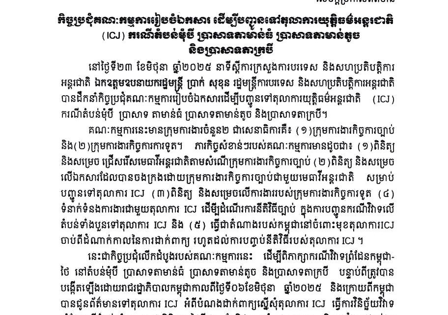ព័ត៌មានជាតិ កិច្ចប្រជុំគណៈកម្មការរៀបចំឯកសារ ដើម្បីបញ្ជូនទៅតុលាការយុត្តិធម៌អន្តរជាតិ (ICJ) ករណីតំបន់មុំបី ប្រាសាទតាមាន់ធំ ប្រាសាទតាមាន់តូច និងប្រាសាទតាក្របី កិច្ចប្រជុំគណៈកម្មការរៀបចំឯកសារ ដើម្បីបញ្ជូនទៅតុលាការយុត្តិធម៌អន្តរជាតិ (ICJ) ករណីតំបន់មុំបី ប្រាសាទតាមាន់ធំ ប្រាសាទតាមាន់តូច និងប្រាសាទតាក្របី