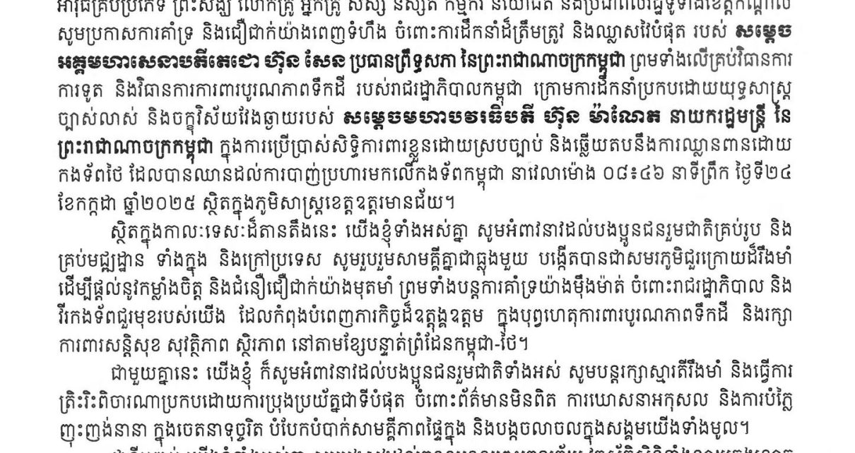 ព័ត៌មានជាតិ រដ្ឋបាលខេត្តកណ្តាល គាំទ្ររាជរដ្ឋាភិបាលកម្ពុជាចំពោះការឆ្លើយតបដោយប្រដាប់អាវុធ ប្រឆាំងនឹងការឈ្លានពានទឹកដីកម្ពុជាពីសំណាក់កងទ័ពថៃ រដ្ឋបាលខេត្តកណ្តាល គាំទ្ររាជរដ្ឋាភិបាលកម្ពុជាចំពោះការឆ្លើយតបដោយប្រដាប់អាវុធ ប្រឆាំងនឹងការឈ្លានពានទឹកដីកម្ពុជាពីសំណាក់កងទ័ពថៃ