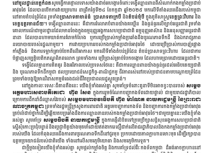 ព័ត៌មានជាតិ ក្រុមការងារចលនាកសាងសមាជិកគណបក្សនៅមូលដ្ឋានខេត្តកំពត ចេញញត្តិថ្កោលទោស ចំពោះការឈ្លានពានរបស់ថៃមកលើបូរណភាពទឹកដីកម្ពុជា ញត្តិថ្កោលទោស ចំពោះការឈ្លានពានរបស់ថៃមកលើបូរណភាពទឹកដីកម្ពុជា យើងខ្ញុំទាំងអស់គ្នាជាថ្នាក់ដឹកនាំ និងសមាជិក សមាជិកា នៃក្រុមការងារចលនាកសាងសមាជិកគណបក្សនៅមូលដ្ឋានខេត្តកំពត