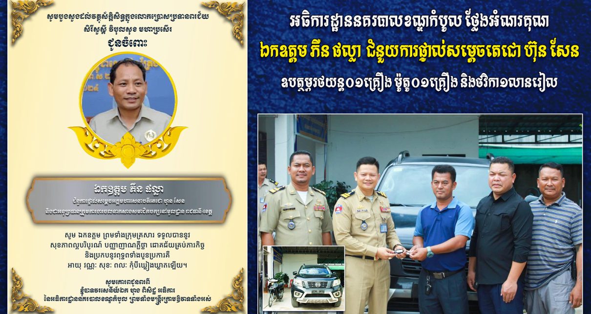 ព័ត៌មានជាតិ អធិការដ្ឋាននគរបាលខណ្ឌកំបូល ថ្លែងអំណរគុណ ឯកឧត្ដម ភឺន ផល្លា ជំនួយការផ្ទាល់សម្ដេចតេជោ ហ៊ុន សែន ដែលបានឧបត្ថម្ភរថយន្ត០១គ្រឿង និងម៉ូតូ០១គ្រឿង ព្រមទាំងថវិកា១លានរៀល រាជធានីភ្នំពេញ៖ នាថ្ងៃទី១៨ ខែកក្កដា ឆ្នាំ២០២៥នេះ លោកវរសេនីយ៍ឯក ហុង ពិសិដ្ឋ អធិការនៃអធិការដ្ឋាននគរបាលខណ្ឌកំបូល រាជធានីភ្នំពេញ បានចេញលិខិតថ្លែងអំណរគុណចំពោះ ឯកឧត្ដម ភឺន ផល្លា