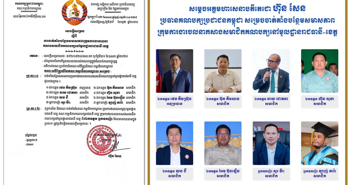 ព័ត៌មានជាតិ សម្តេចតេជោ ហ៊ុន សែន ចាត់តាំងសមាសភាព ឯកឧត្តម អ្នកឧញ៉ា ចំនួន០៨នាក់ ជាក្រុមការងារចលនាកសាងសមាជិកគណបក្សនៅមូលដ្ឋានរាជធានី~ខេត្ត នាថ្ងៃទី១៨ ខែកក្កដា ឆ្នាំ២០២៥នេះ សម្តេចអគ្គមហាសេនាបតីតេជោ ហ៊ុន សែន ប្រធានគណបក្សប្រជាជនកម្ពុជា (គណៈអចិន្ត្រៃនៃគណៈកម្មាធិការកណ្តាល) បានចេញសេចក្តីសម្រេចលេខ:៦៣៣/០៧២៥/សស.គក ស្តីពីការចាត់តាំងបន្ថែមសមាសភាពក្រុមការងារចលនាកសាងសមាជិកគណបក្សនៅមូលដ្ឋានរាជធានី~ខេត្ត