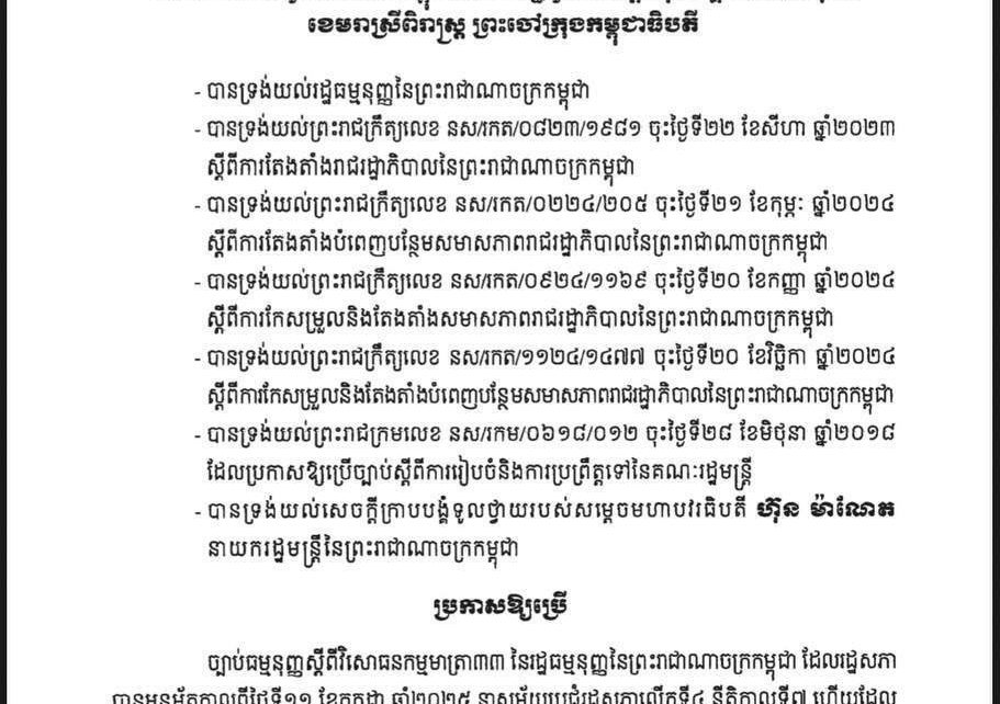 ព័ត៌មានជាតិ ព្រះរាជក្រម ប្រកាសឱ្យប្រើ ច្បាប់ធម្មនុញ្ញស្តីពីវិសោធនកម្មមាត្រា៣៣ នៃរដ្ឋធម្មនុញ្ញនៃព្រះរាជាណាចក្រកម្ពុជា ដែលរដ្ឋសភា បានអនុម័ត… ព្រះរាជក្រម ប្រកាសឱ្យប្រើ ច្បាប់ធម្មនុញ្ញស្តីពីវិសោធនកម្មមាត្រា៣៣ នៃរដ្ឋធម្មនុញ្ញនៃព្រះរាជាណាចក្រកម្ពុជា ដែលរដ្ឋសភា បានអនុម័តកាលពីថ្ងៃទី១១ ខែកក្កដា