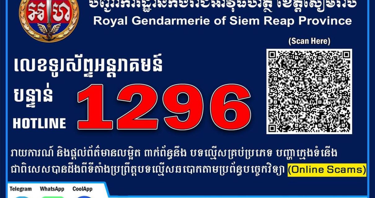 ព័ត៌មានជាតិ (Hotline) 1296 (ដោយឥតគិតថ្លៃ 24/24ម៉ោង) កងរាជអាវុធហត្ថខេត្តសៀមរាប សូមជម្រាបជូនបងប្អូនប្រជាពលរដ្ឋ ក្នុងខេត្តសៀមរាប! កងរាជអាវុធហត្ថខេត្តសៀមរាប សូមជម្រាបជូនបងប្អូនប្រជាពលរដ្ឋ ក្នុងខេត្តសៀមរាប ឲ្យបានជ្រាបថា ៖ បើសិនជាបងប្អូនប្រជាពលរដ្ឋ បានជួបហេតុការណ៍បន្ទាន់ត្រូវការអន្តរាគមន៍ពាក់ព័ន្ធនឹង បទល្មើសគ្រប់ប្រភេទ
